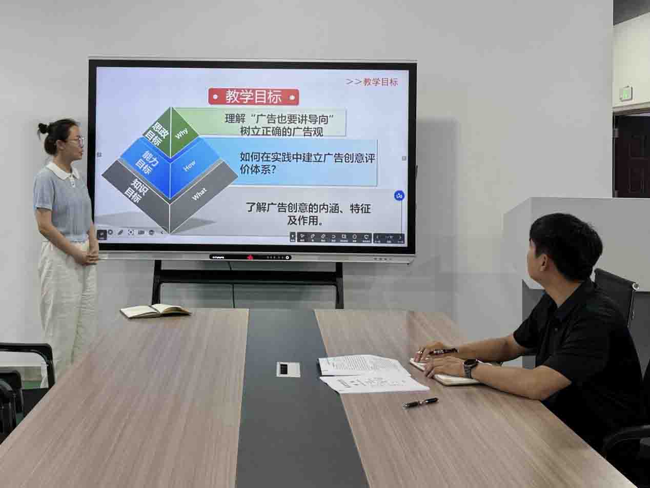 教师们依次登上讲台,进行精心准备的试讲。他们所涉及的课程涵盖AI、创业营销、广告创意、知识产权等领域,充分体现了学院在课程体系建设上的多元化与全面性。