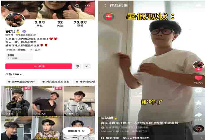 我校创新创业达人郭旭同学(抖音名:小旭上大七)(快手名:锅旭)凭借优质内容在抖音、快手平台快速走红,成为备受关注的网红小达人。截至目前,他已累计发布短视频 518 条,内容贴近生活、风格鲜明,深受广大粉丝喜爱与追捧,账号粉丝量稳步攀升超过 10万。高频次的内容输出与持续曝光,不仅展现了郭旭同学的创意才华与实践能力,更彰显了我校创新创业育人体系对学生个性发展与潜能挖掘的有力支撑,为青年学子创新创业树立了生动榜样。
