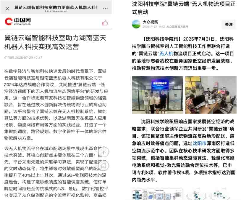 我校创新创业孵化基地在孵创业公司—“翼链云端”无人机物流项目(创始人:王正帅、李鹏)近日获今日头条、中国网两家媒体关注报道。该项目由我校与智械空创人工智能科技工作室联合孵化,已从校园走向社会,与湖南蓝天机器人科技有限公司开展产学研合作,共同研发智能物流调度平台。该平台通过算法优化与系统集成,在实际试运行中实现配送效率提升约40%,运营成本降低近30%,正逐步参与解决区域物流“最后一公里”难题,体现出我校创新创业项目在服务地方经济发展中的实际价值与应用潜力。此次媒体报道,既是对学生团队创新能力的认可,也反映出我校双创教育在推动项目落地、服务社会需求方面的积极成效。