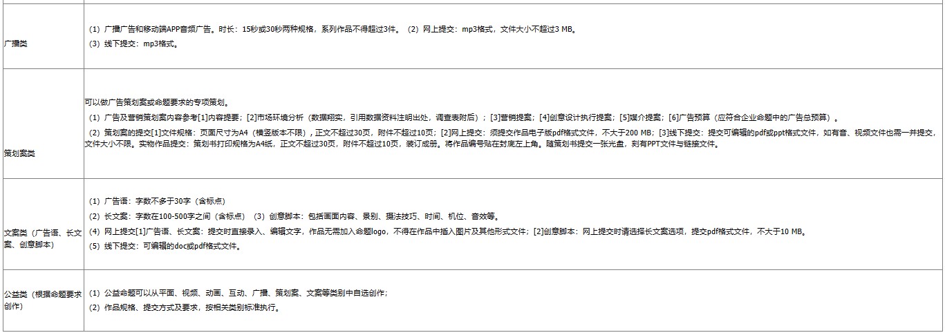 我校在籍在校大学生均可参加,以团队或个人的方式参加竞赛。平面类、文案类1-2人/组;短视频、互动类、广播类1-3人/组;其他视频类(影视广告、微电影广告)、动画类、策划案类1-5人/组。指导教师人数:平面类、文案类不得超过1人/组;其他类别1-2/组。