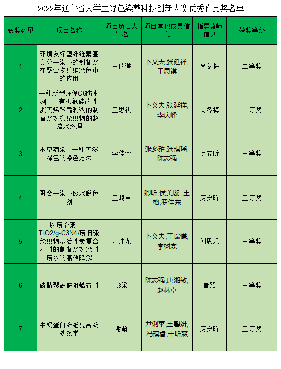 近日,由辽宁省教育厅主办,辽东学院承办的2022年辽宁省大学生绿色染整科技创新大赛落下帷幕。在本次比赛中我校喜获二等奖2项,三等奖5项,其中尚冬梅老师获得“优秀指导教师”荣誉称号,我校获得“优秀组织单位”奖。