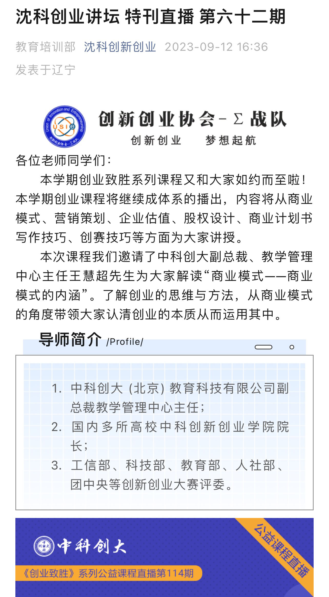 上条:【沈科创业讲坛】特刊直播第六十一期