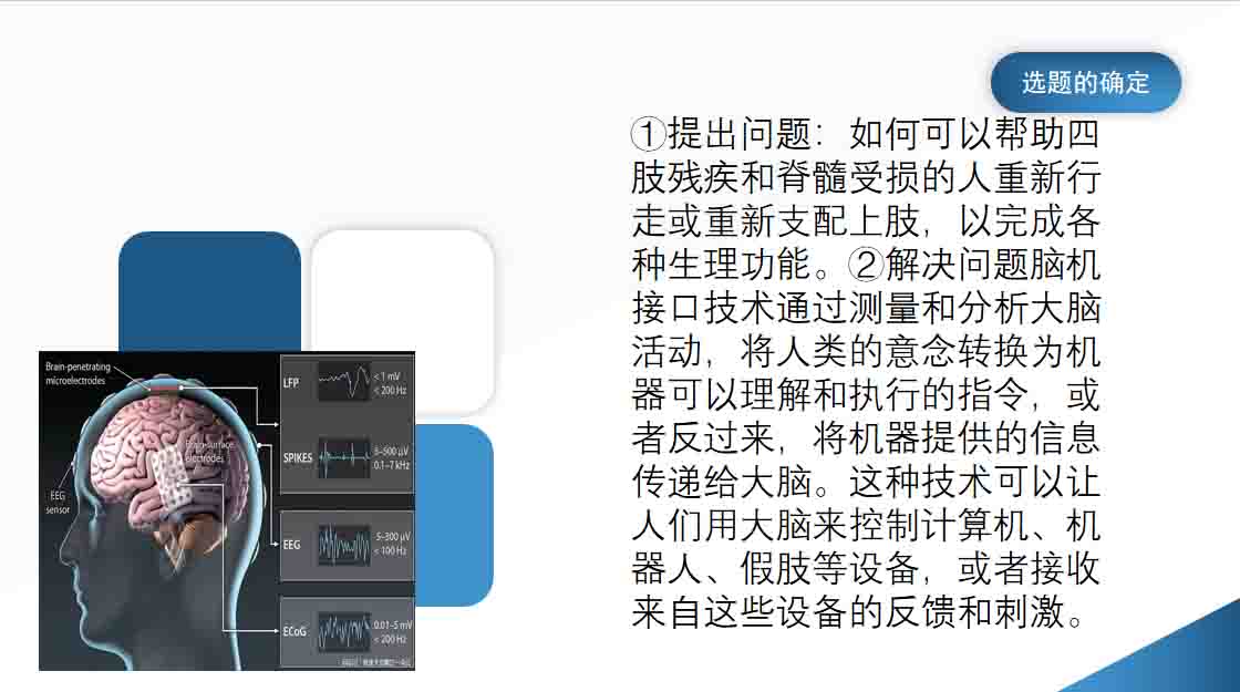 脑机接口技术通过测量和分析大脑活动,将人类的意念转换为机器可以理解和执行的指令,或者反过来,将机器提供的信息传递给大脑。这种技术可以让人们用大脑来控制计算机、机器人、假肢等设备,或者接收来自这些设备的反馈和刺激。