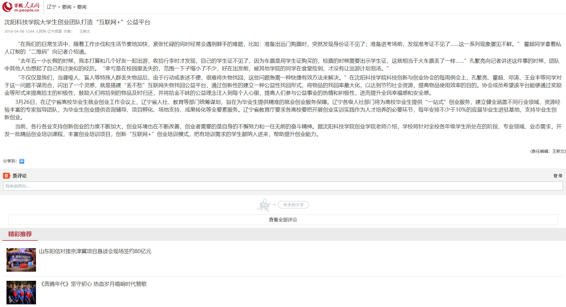 我校学生创新创业事迹受到人民网报道