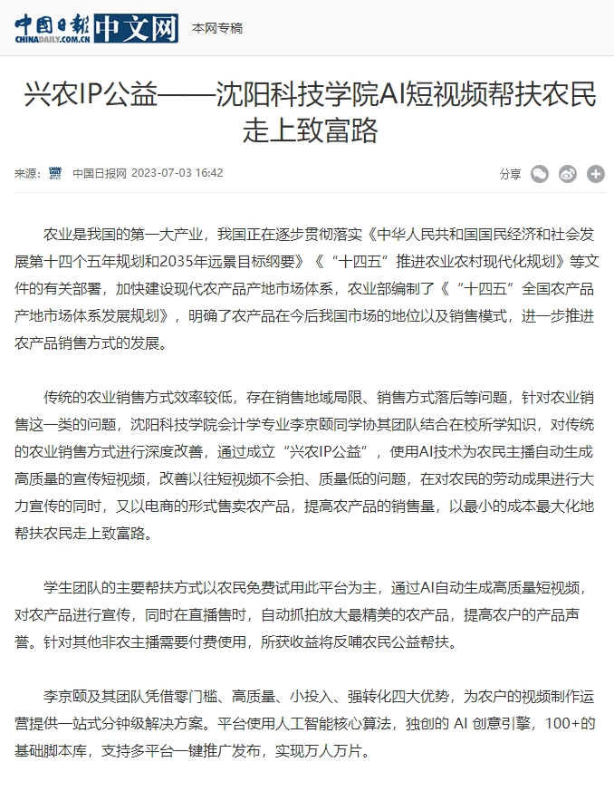 兴农IP公益——我校AI短视频帮扶农民走上致富受到中国日报报道